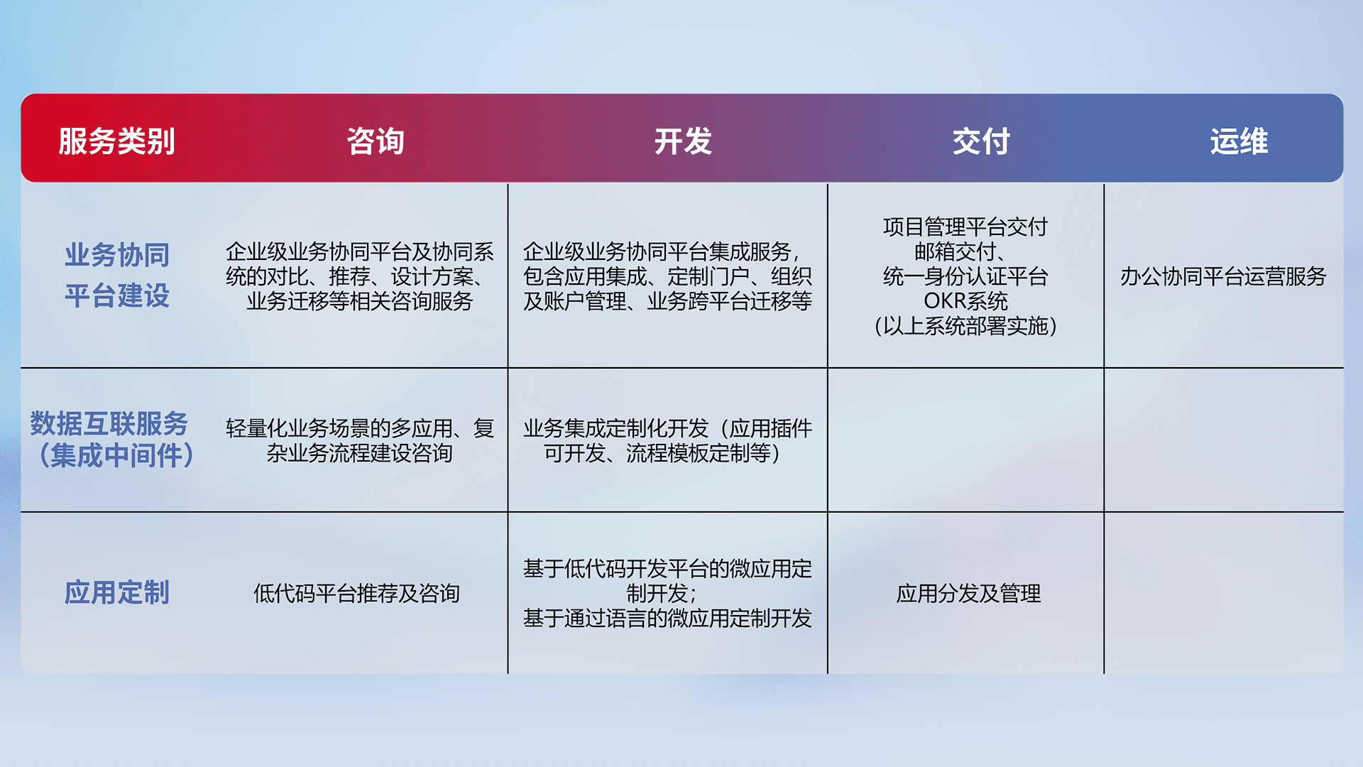 针对钉钉、、企微、、IDaas等平台级产品提供产品的规划、、、方案、、、、交付、、定制化开发等服务,,,实现如统一协同办公、、、、智能客户服务、、、、混合会议管理、、、智能数据查询、、、等业务场景,,实现数字化转型。。。。