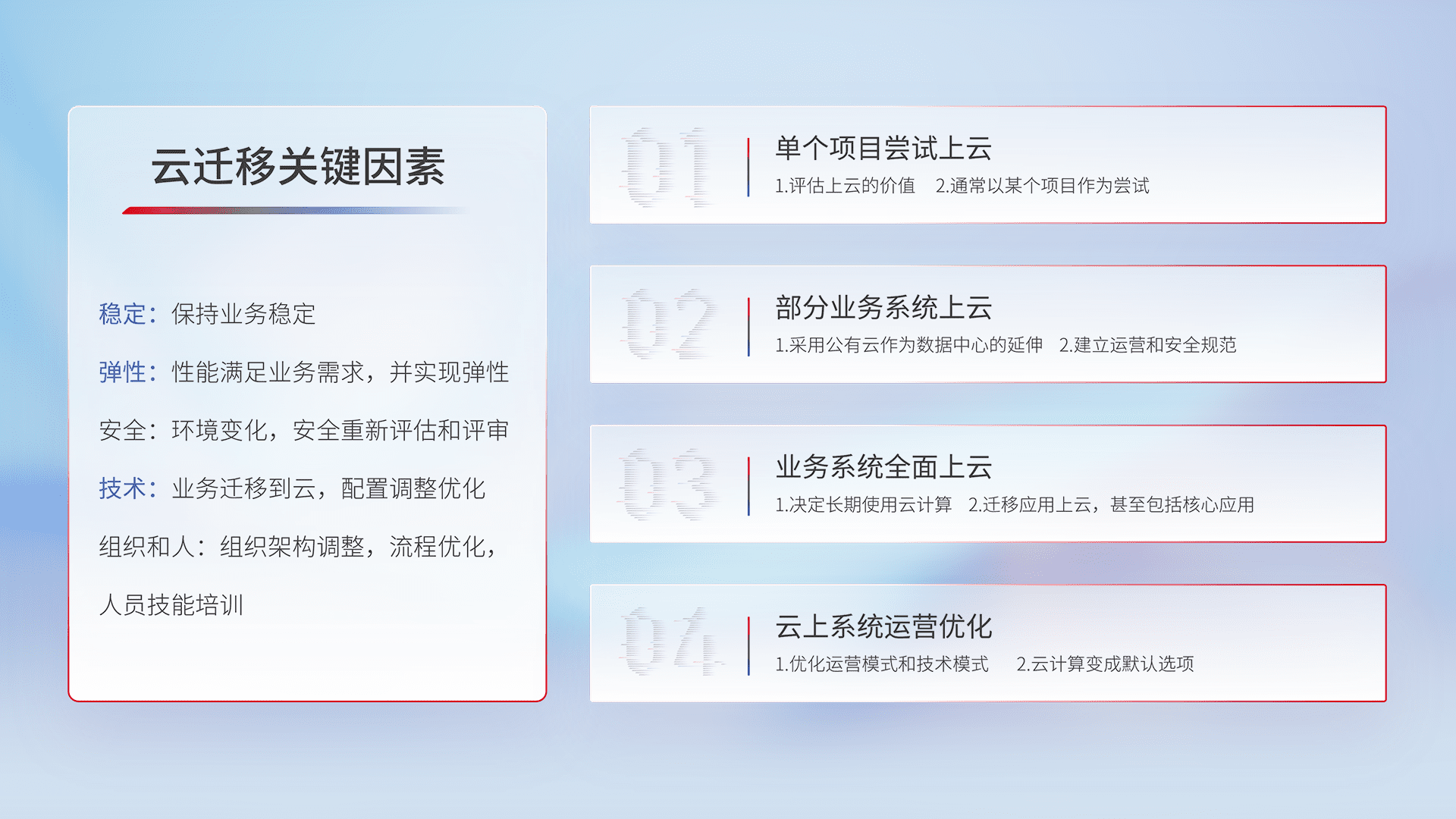 结合实际业务,,,从规划设计、、、云平台选型、、云原生改造、、、数据迁移、、、集成交付,,,迁移全过程为客户识别最佳上云路径,,做好风险识别管理,,,,设计网络架构、、身份权限、、安全审计合规、、操作审计、、、日志审计、、、监控告警策略、、、多站点容灾设计等,,,,对云上基础设施进行整体规划,,,提升IT治理水平,,,以满足弹性、、、、高可用、、、、高性能的需求。。。