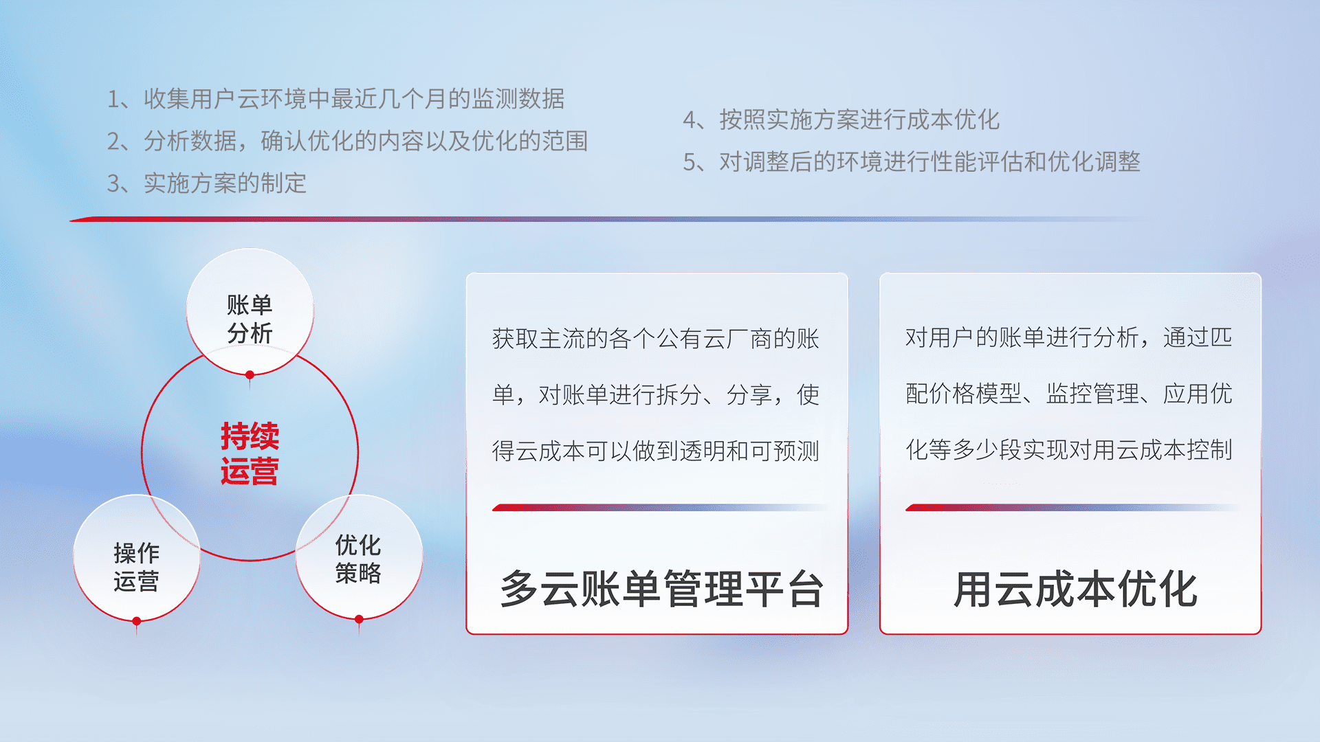 通过多云纳管,,以统一的资源数据模型把客户的云资源进行抽象和封装,,,,进而实现对多云资源的统一操作,,,,保障云资源管理的可靠性、、、稳定性与可用性。。。。量身定制化运维内容,,,配置、、、、开发运维、、、、补丁管理、、、、备份、、、、监控、、、、认证和访问管理、、审计和日常巡检等,,保障在用云过程中的可靠度,,,,稳定度以及高可用率。。