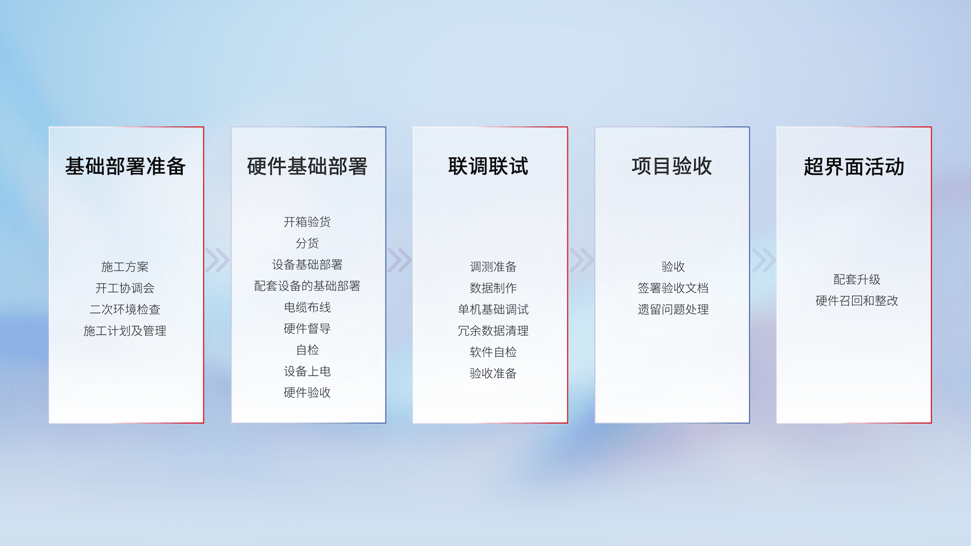 从基础部署准备、、、硬件基础部署、、、、联调联试、、、、项目验收、、、越界面活动的全过程可追溯,,,保证施工质量和进度。。。。